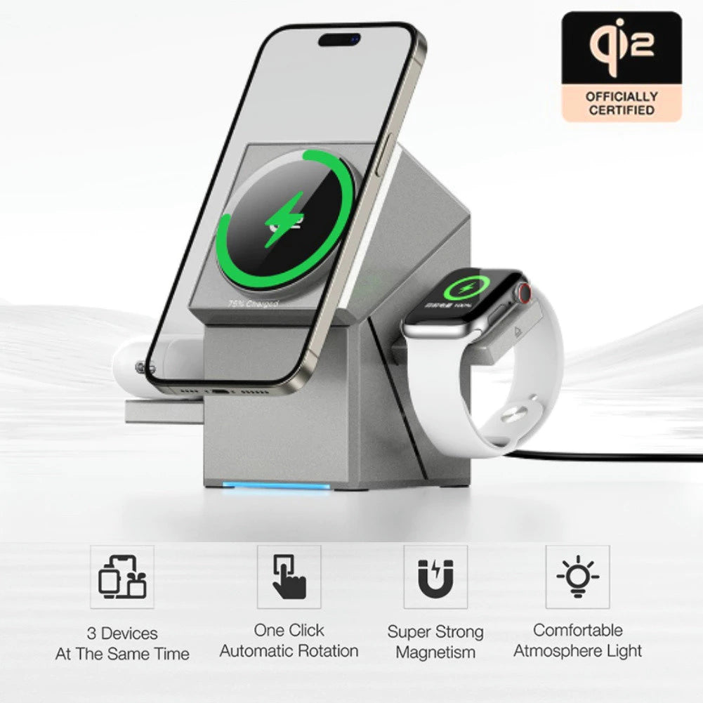 Auto-Rotating Phone Stand for Convenient Use: Featuring an innovative auto-rotating phone stand, this charger offers hands-free convenience, automatically adjusting the angle of your phone for easy viewing.